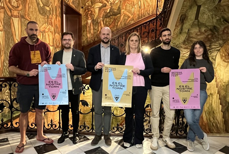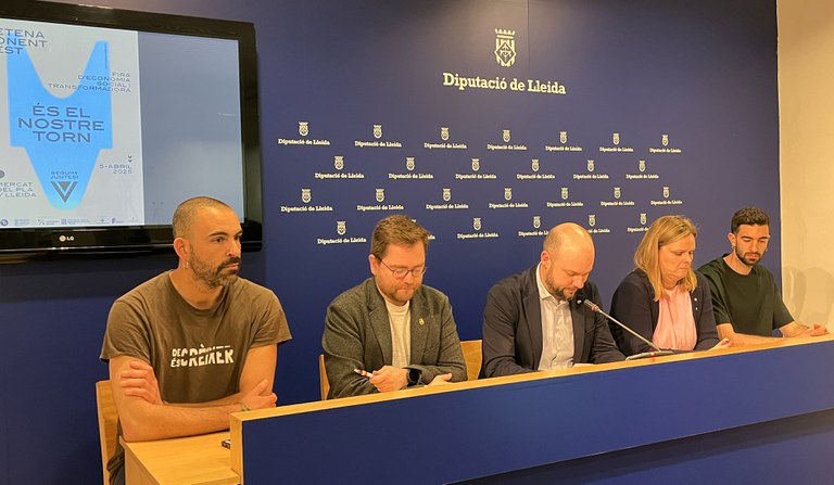 La Ponent FEST canvia la ubicació de la seva setena edició i es trasllada al Centre Històric per instal·lar al Mercat del Pla les seves parades i activitats vinculades a l’economia social i transformadora. La fira té per lema “És el nostre torn” i tindrà lloc el dissabte 5 d’abril, de les 16.30 h a les 20 h, amb una trentena d’estants i cooperatives lleidatanes vinculades a l’economia social i solidària. El regidor de Participació, Roberto Pino, ha assistit a l’acte de presentació de la 7a Ponent Fest, que s’ha fet a la Diputació de Lleida, amb el vicepresident del Patronat de Promoció Econòmica, Jordi Verdú; la directora dels Serveis Territorials d’Empresa i Treball a Lleida, Pilar Espax; el portaveu de Ponent Coopera, Sebastià Mata, i el tècnic de Ponent Coopera i organitzador de la Ponent FEST, Èric Morros.