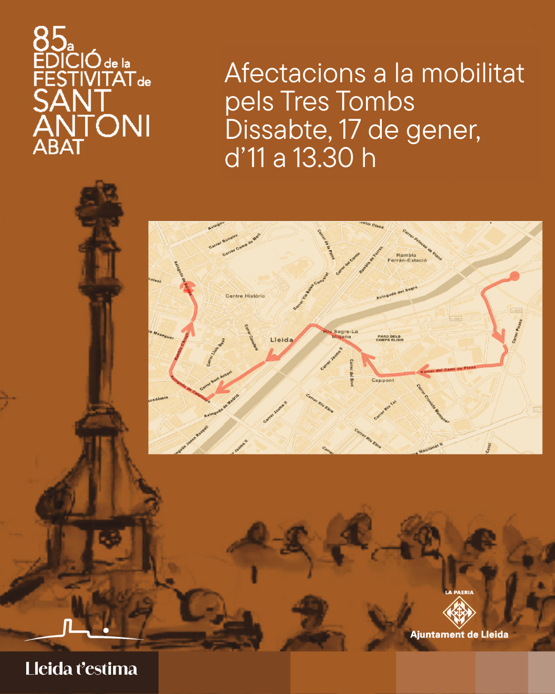 La ciutat celebrarà aquest dissabte, 17 de gener, la tradicional desfilada dels Tres Tombs de Sant Antoni Abat, que enguany presenta un canvi en el recorregut habitual. La rua s’iniciarà a les 11.15 hores des del recinte de les Firetes, situat al camí de Granyana, i finalitzarà aproximadament a les 13.30 hores a la Creu dels Tres Tombs.