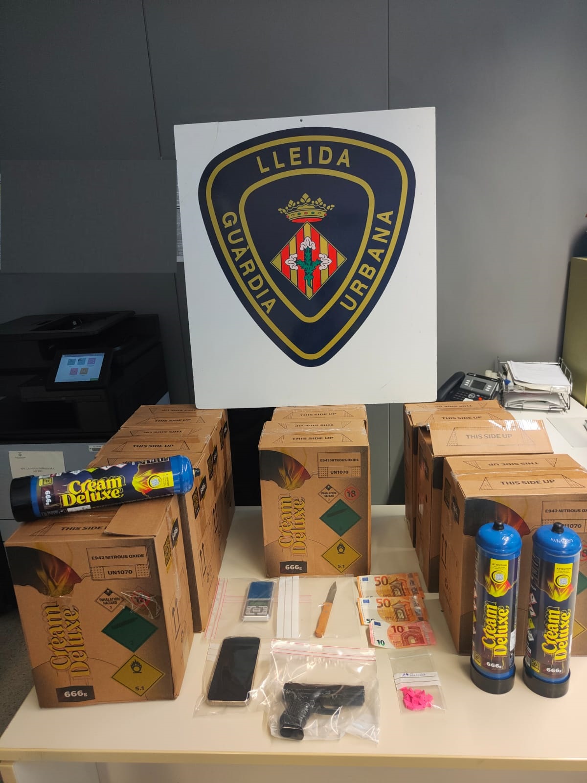 En el primer cas, la policia municipal va detenir una persona al carrer Anselm Clavé i li va decomissar 51 ampolles d’òxid nitrós, 24 pastilles d’amfetamines, una bàscula de precisió, una pistola simulada, un ganivet i diners en efectiu que es van localitzar a l’interior del seu vehicle.