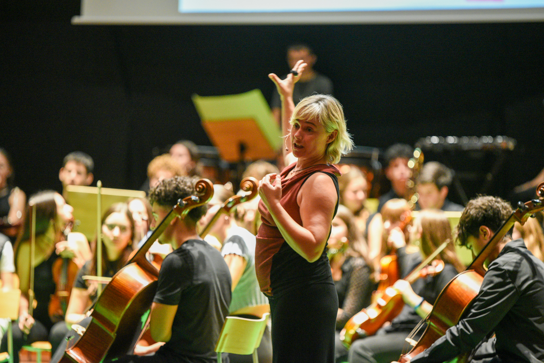 La xerrada que portava per títol, “la Intel·ligència Artificial com a eina de suport a la improvisació”, ha culminat a l’escenari de l’Auditori Enric Granados on 77 alumnes de l’escola de música ‘l’Intèrpret’ i de l’Orquestra Simfònica del Conservatori han interpretat una peça de composició instantània utilitzant aquesta IA, ”integrant la música electrònica dins del que està succeint a nivell acústic”.