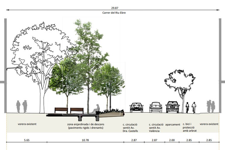 Pel que fa al projecte de Riu Ebre, s’actuarà entre la rambla Doctora Castells i l’avinguda de València, on es crearà un gran passeig verd de més de deu metres d’ample, a la part que correspon a la vorera dels números imparells, incloent la placeta del xamfrà entre Riu Ebre i Doctora Castells. S’eliminarà, doncs, l’asfalt de bona part del carrer i s’hi plantaran 48 arbres i tres mil plantes arbustives, per a promoure el pas de vianants i combatre l’efecte d’illa de calor que fa el paviment.