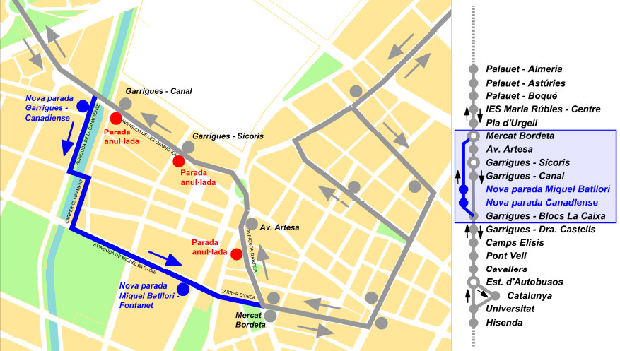 Pel que fa a la línia d’autobús L7 caldrà que modifiqui la seva circulació, desviant-se per la vora del canal i per l’avinguda Miquel Batllori, fins a enllaçar amb el recorregut habitual a l’altura de la plaça Sant Jordi, amb la modificació de tres parades (Canal, Sícoris i Avinguda Artesa), que es traslladen al nou recorregut.