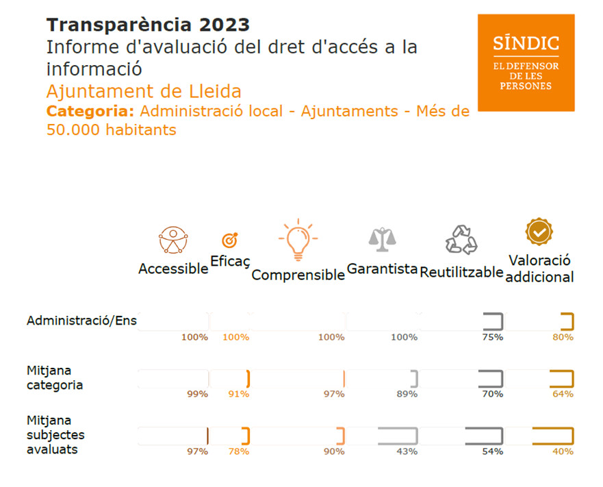 Aquest informe, que avalua el compliment de la Llei de Transparència, avalua amb un 100% els indicadors de l’Ajuntament de Lleida sobre l’accessibilitat, eficàcia, comprensibilitat i les garanties que ofereix; i amb un 75% i un 80% la capacitat de reutilització de la informació i les valoracions addicionals. En tots els casos, la nota obtinguda per la Paeria se situa per sobre de la mitjana de la resta d’ajuntaments catalans i de la mateixa categoria, i per sobre de la mitjana dels subjectes avaluats.