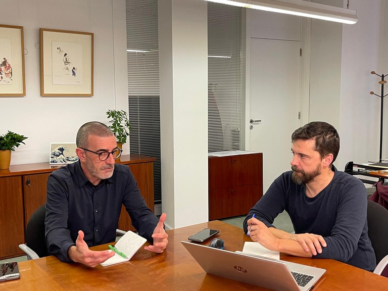 Imatge de la reunió entre el regidor d’Acció i Innovació Social i de Participació i Drets Civils,  Carlos Enjuanes, i el Director General d'acció Cívica i Comunitària, Xavier Godàs.