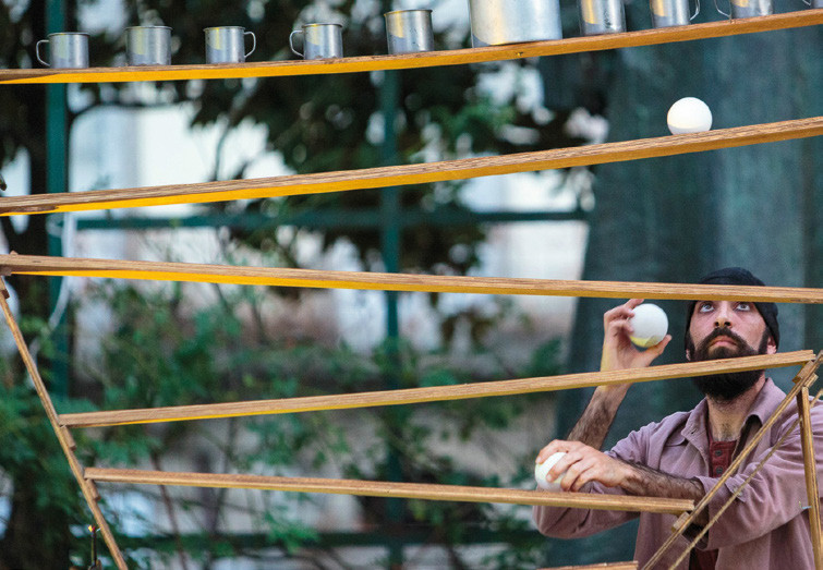 A OYUN (del turc “joc”) tot gira al voltant d’olles i elements quotidians de totes les formes i mides. Construint un artefacte en equilibri, el malabarista va creant un espai, dibuixant l’aire i desafiant la gravetat.