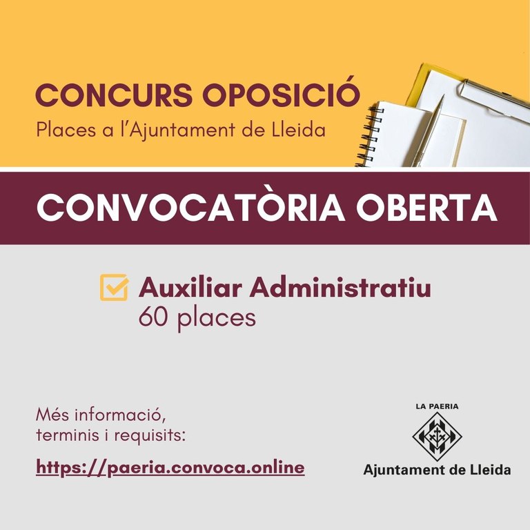L’Ajuntament de Lleida ha publicat avui al Butlletí Oficial de l’Estat (BOE) la convocatòria per a cobrir 59 places d’auxiliar administratiu/va de la plantilla de l’Ajuntament de Lleida i una plaça més assignada a Turisme de Lleida, mitjançant concurs oposició d’accés lliure.