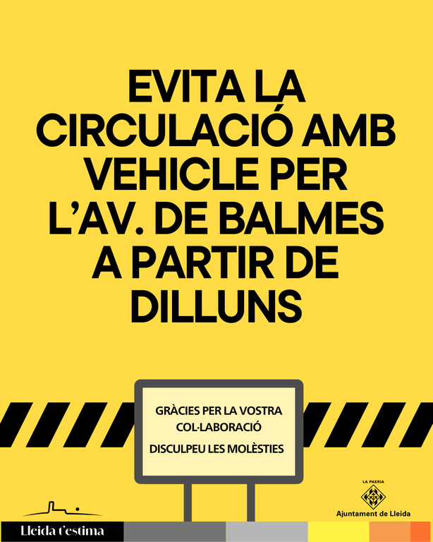 L’Ajuntament de Lleida recomana evitar la circulació amb vehicles pel carrer Balmes a partir d’aquest dilluns i buscar, en la mesura del possible, recorreguts alternatius per evitar embussos, davant l’increment de trànsit amb l’inici del curs escolar.