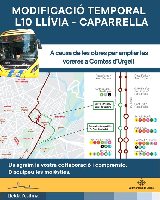 A més, i amb l’objectiu de reforçar el servei en franges de major demanda, la Paeria incorpora un nou vehicle a la línia L10 en les expedicions de les 19.10 h i les 20.10 h, millorant així la capacitat i la puntualitat del servei mentre durin les obres.
