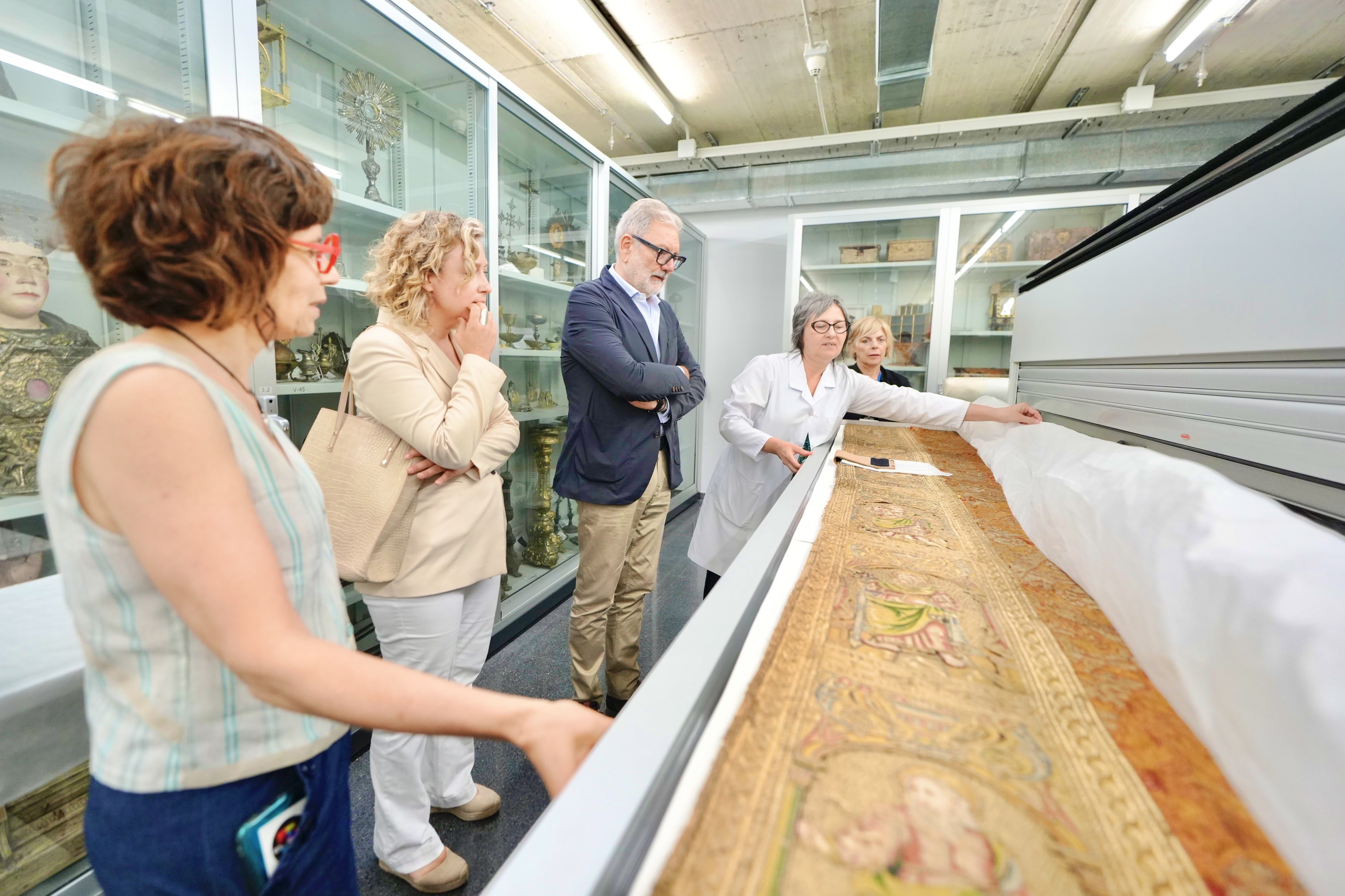 El paer en cap Fèlix Larrosa i la regidora de Promoció de la Ciutat, Pilar Bosch visiten les sales de reserva del Museu de Lleida, acompanyats per la directora del museu, Clara Arbués