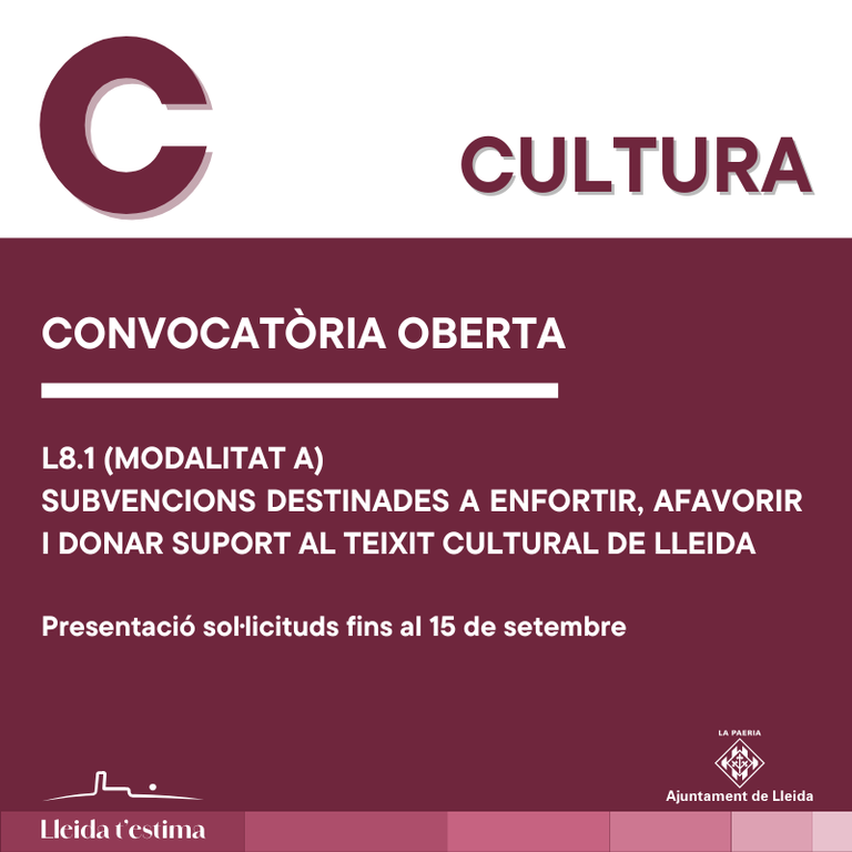 La Regidoria de Cultura obre la convocatòria de la línia de subvencions L.8.1 destinades a enfortir, afavorir i donar suport al teixit cultural de Lleida per a l’any 2025 (modalitat A). L'objectiu d’aquesta resolució és donar suport als projectes i activitats d’entitats culturals sense ànim de lucre de la ciutat que contribueixen a completar el panorama cultural de Lleida, posicionant-la com un referent cultural al territori. El termini de presentació de sol·licituds finalitzarà el 15 de setembre de 2025.