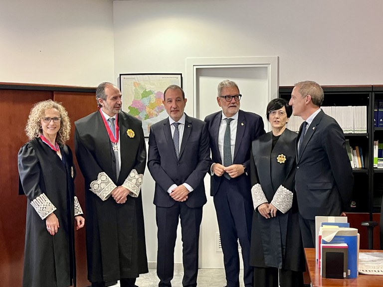 L'alcalde, Fèlix larrosa, el conseller de Justícia i Qualitat Democràtica de la Generalitat, Ramon Espadaler, el subdelegat del govern, José Crespín, i el nou president de l'Audiència Provincial, Albert Guilanyà, amb l'expresidenta Lucía Jiménez i una magistrada abans de la presa de possessió.
