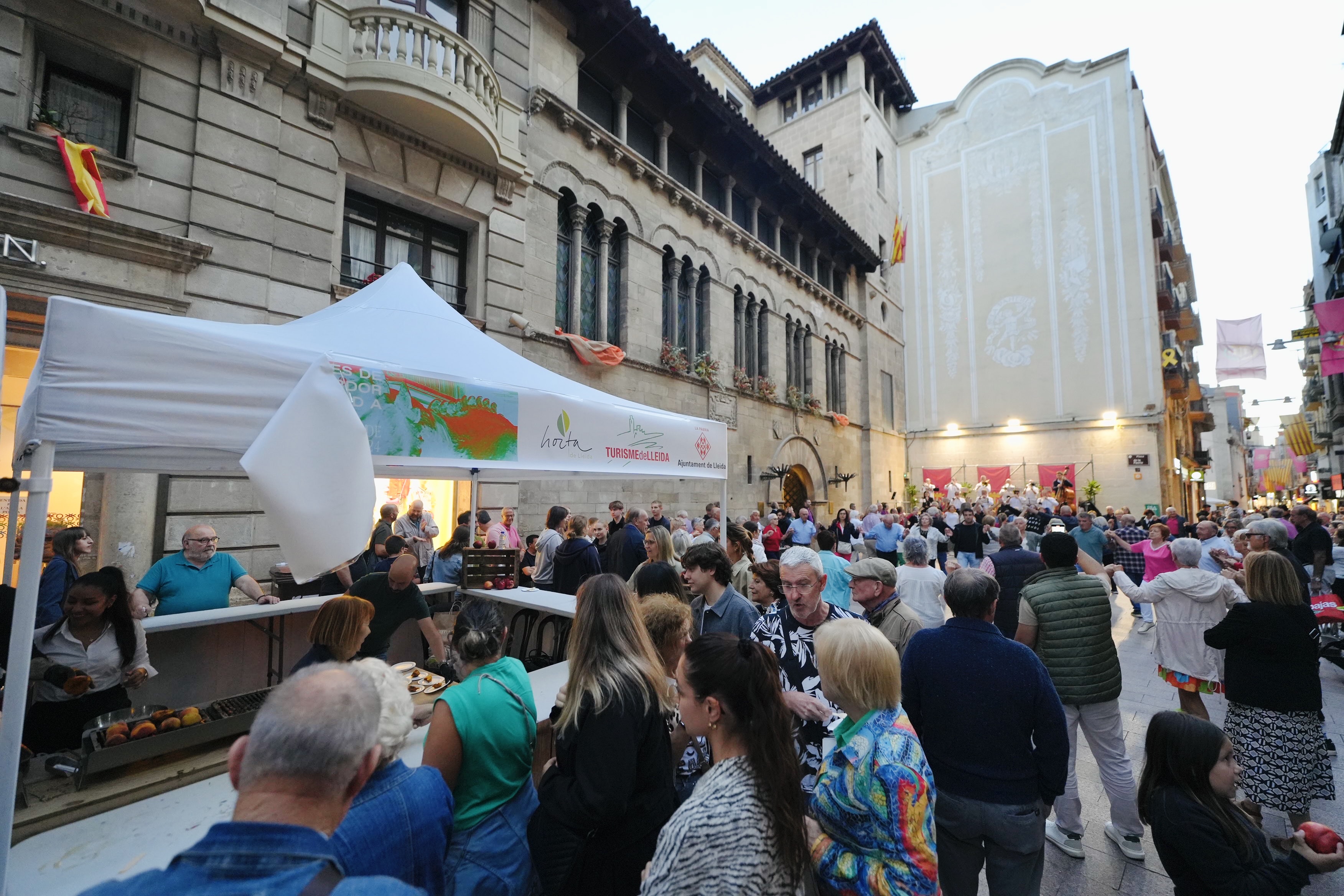 La plaça de la Paeria s’ha omplert per escoltar el pregó d’enguany, que, a més, ha comptat amb un tast de fruita organitzat per Turisme de Lleida i per la marca Horta de Lleida, previ al pregó. El tast ha donat l’oportunitat als i les assistents de degustar porcions de fruita de Lleida a la brasa, amb mel i canyella. Per amenitzar la degustació, i com a novetat, hi ha hagut una sessió de garrotins a càrrec del grup musical Machín.