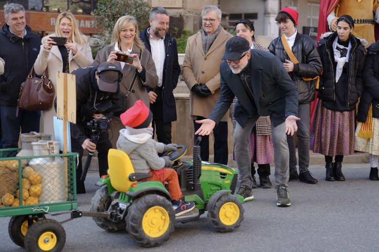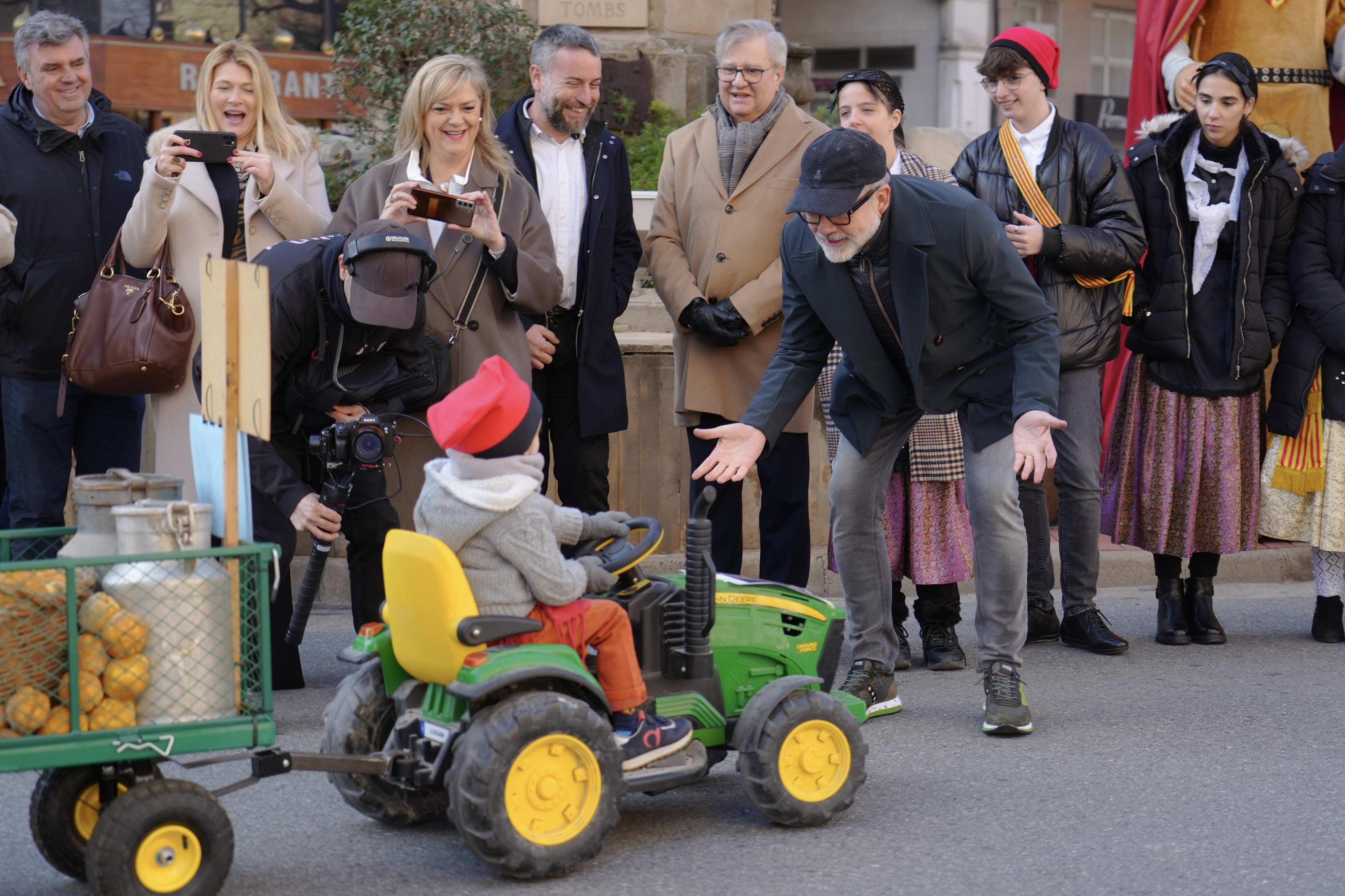 L'alcalde saluda el participant més jove en la desfilada dels Tres Tombs d'avui..