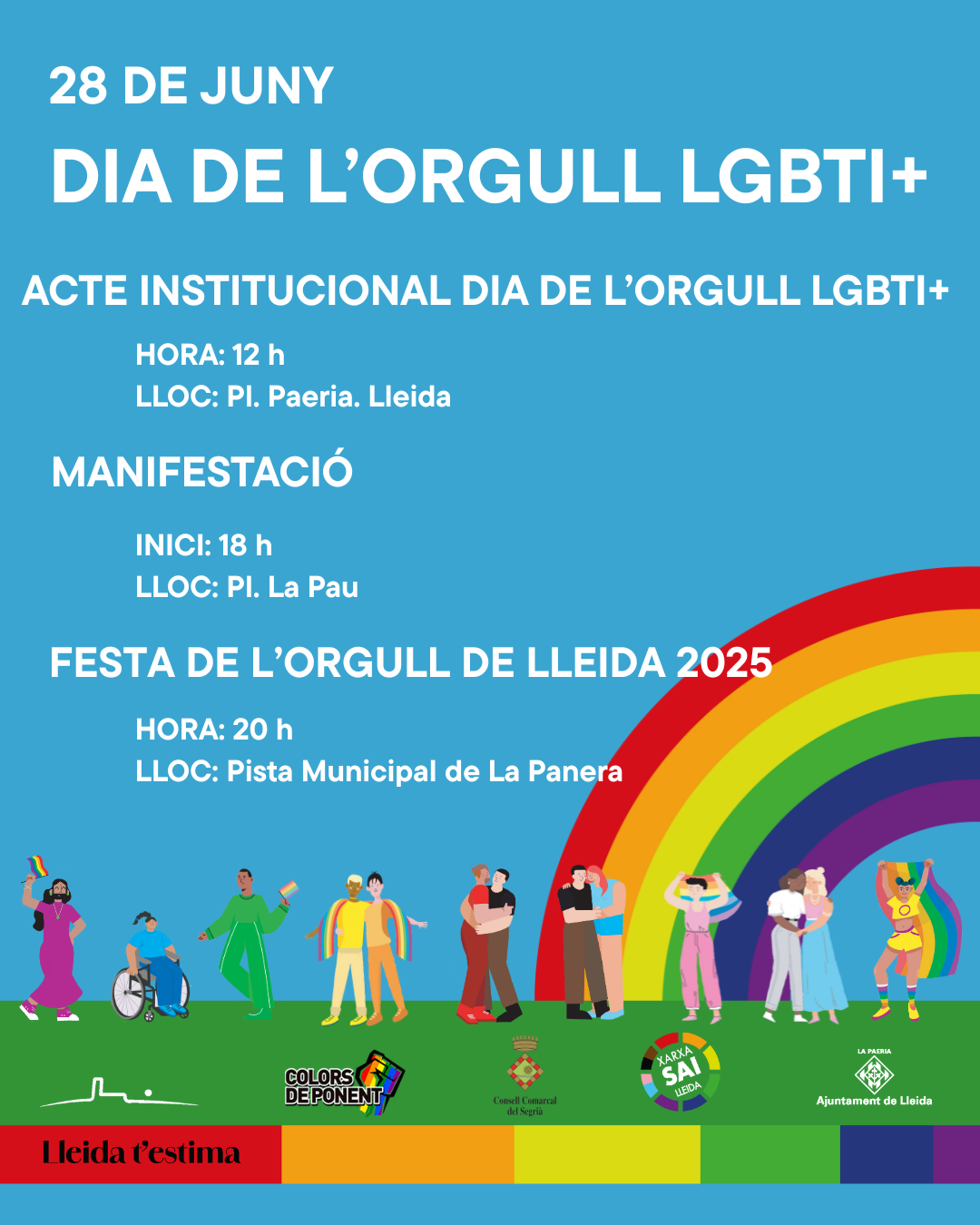 La jornada començarà amb l’acte institucional, que es farà a les 12 del migdia a la plaça de la Paeria. A la tarda, tindrà lloc una manifestació, amb sortida a les 18 h des de la plaça de la Pau, organitzada per Colors de Ponent, que donarà pas a la part més festiva de la programació.