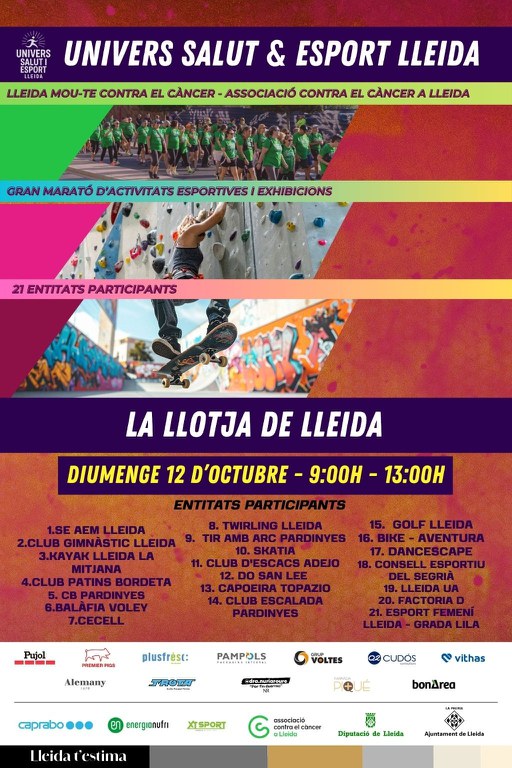 Lleida viurà demà diumenge, 12 d’octubre, una jornada dedicada a la promoció de la salut, l’activitat física i la solidaritat amb la celebració conjunta de la 13a edició del Mou-te contra el Càncer i la I Jornada Univers Salut i Esport. La doble proposta tindrà lloc de 09 a 13 h, a la plaça de la Llotja, amb la caminada que s’iniciarà en aquest mateix espai a les 10 h. La jornada està pensada per a tota la ciutadania, amb especial atenció a la inclusió i la participació activa.