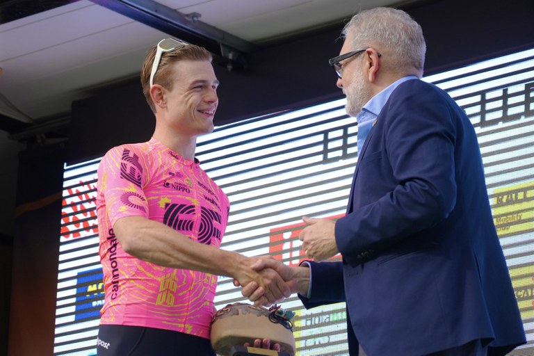 L’alcalde Larrosa que ha lliurat el Premi de la Ciutat de Lleida a Marijn van den Berg, ha rebut el cartell de l’actual edició de la prova catalana de la mà del president de la Volta Ciclista a Catalunya, Rubèn Peris.