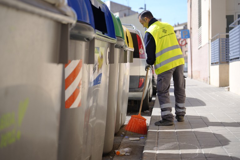 Un dels operaris de la brigada netejant una àrea de contenidors a Pardinyes.