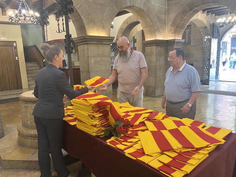 Avui, al pati de la Paeria, s’ha començat a repartir senyeres a la ciutadania, que també podrà recollir-ne demà, dimecres, de 10 a 13 h