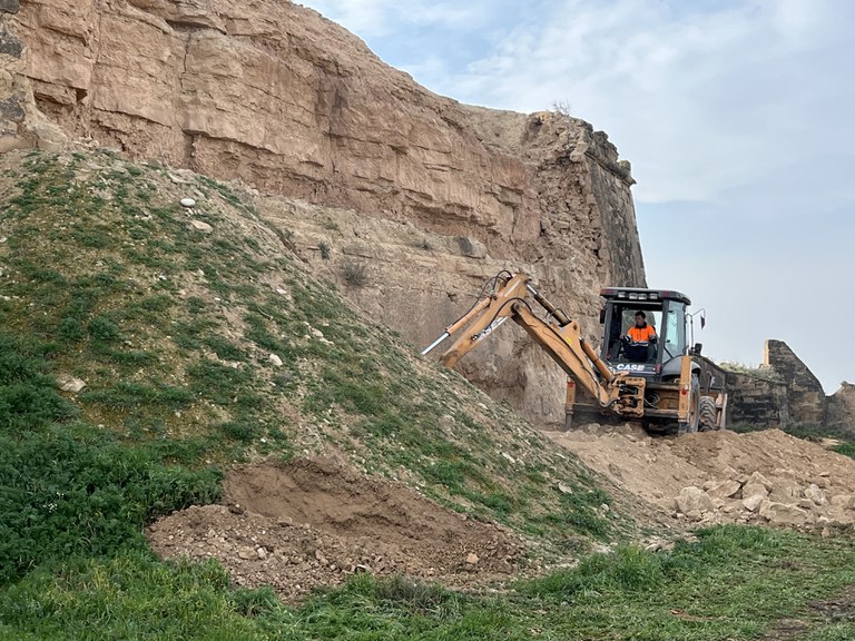 Es treballa per consolidar les restes de la muralla del segle XVII, tant en el tram on fa temps es va produir una esllavissada com als contigus. L’actuació, que s’ha vist retardada per l’aparició de restes arqueològiques, consisteix en reconstruir el tram esllavissat a partir d’una reinterpretació del sistema constructiu primigeni, ha explicat l’arquitecte municipal Jaume Terés, responsable de l’obra. Així, es substituirà el rebliment original d’argiles i llims per un fet a base de tàpia de calç ciclopi, per garantir l’estabilitat del terreny sense alterar la configuració original.