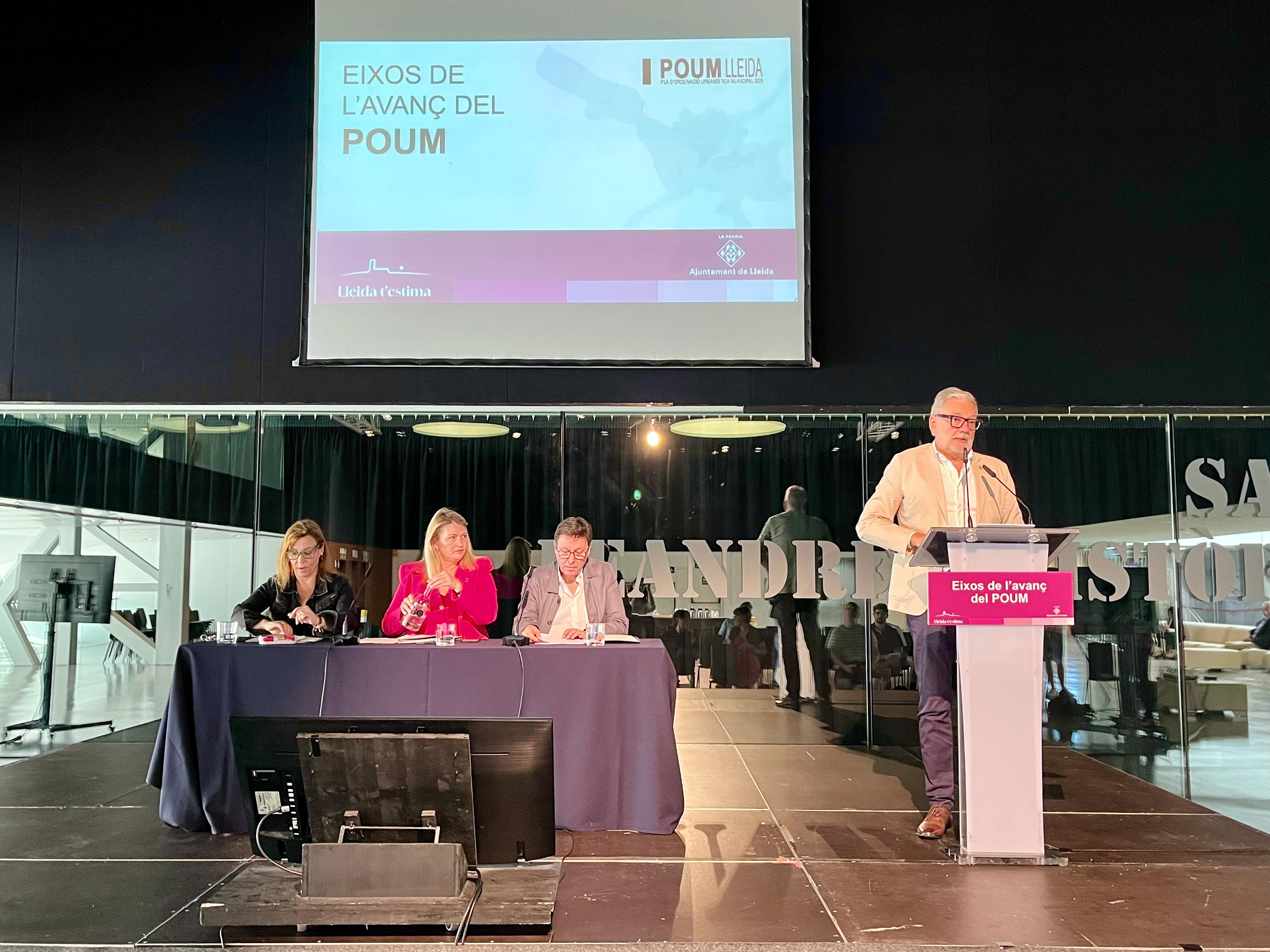 El paer en cap ha presentat avui els eixos de l’avanç del nou Pla d’Ordenació Urbanística Municipal, que aposta per les grans operacions econòmiques, amb fins a 600 ha per a noves àrees d’activitat empresarial, en una Lleida amb més qualitat urbana i zones verdes, que preveu arribar als 180.000 habitants