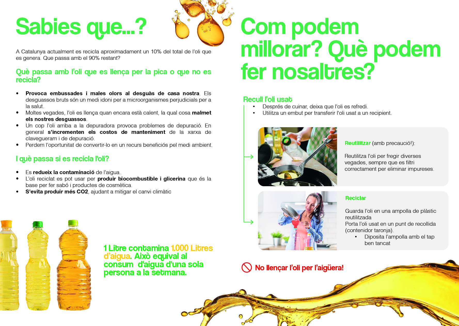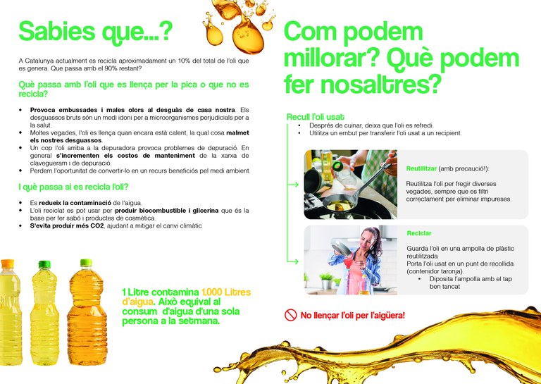 A més a més, també estan en marxa els punts informatius a càrrec d’educadors ambientals on s’ofereix informació sobre el correcte reciclatge de l'oli de cuina usat i es lliuren embuts especials per facilitar-ne la recollida a les llars.