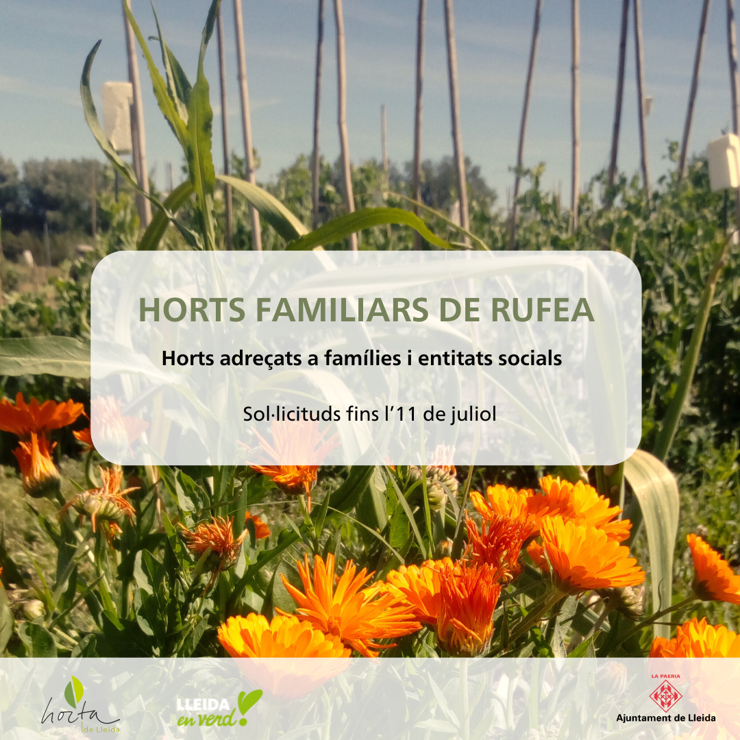 L’Ajuntament de Lleida ha obert una nova convocatòria de sol·licituds per a llogar un hort familiar a la partida de Rufea. Les persones i entitats interessades poden demanar una de les 13 parcel·les disponibles fins al dia 11 de juliol a les 13 hores a l’Oficina Municipal d'Atenció Ciutadana (OMAC), a la Rambla Ferran 32, de forma presencial o per correu postal. Cada parcel·la té 100 m2 i s’hi pot cultivar tot tipus d’hortalisses, verdures i flors, a més d’arbusts que no superin el metre i mig d’alçada. La finalitat del projecte és oferir a la ciutadania l’oportunitat de produir i consumir productes alimentaris de qualitat i promoure l’exercici físic. També pretén fomentar els valors de l’Horta i els sistemes de producció agraris respectuosos amb el medi ambient.