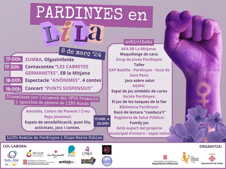 El Pla Educatiu d’Entorn de Lleida, des de la Regidoria d’Educació de La Paeria i a través de la comissió escola i entorn del barri de Pardinyes, ha organitzat la tercera edició del “Pardinyes en Lila” que té com a objectiu sensibilitzar vers el gènere en la coeducació. La jornada s’adreça a infants, joves i famílies i constarà de vàries propostes culturals de conscienciació per fomentar la igualtat amb perspectiva de gènere i fomentar veus crítiques al respecte. Les activitats tindran lloc demà divendres, dia 8, a la tarda, de les 17.00 a les 20 h, i es farà a la plaça Maria Rúbies i a la rambla de Corregidor Escofet.
