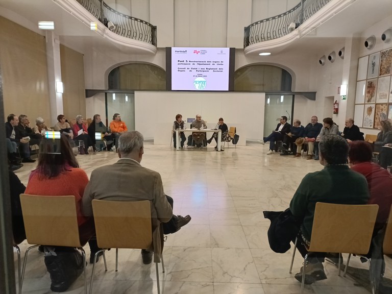 En aquesta trobada, a la qual van assistir una cinquantena de persones en representació del sector de la cultura es va descriure als assistents i assistentes el nou model d'organització i funcionament del Consell de Ciutat amb què treballa l'equip de renovació de l'Acció Participativa de l'Ajuntament de Lleida des de mitjans del 2021.