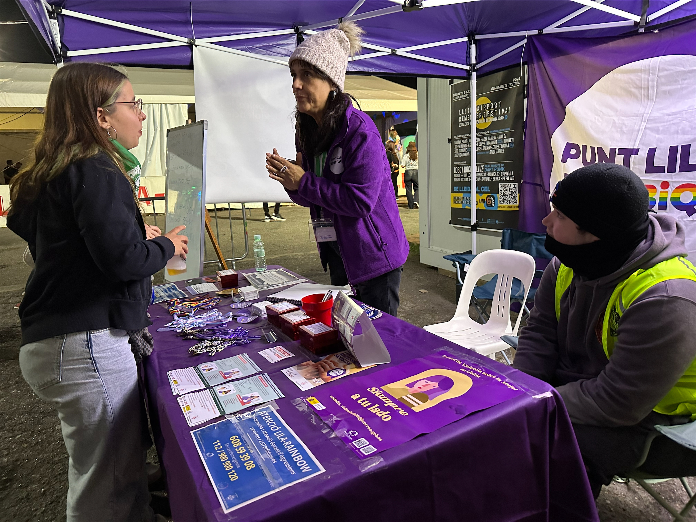 Els punts de Servei PuntLilaRainbow estan formats per equips itinerants mixtes integrats per un mínim de 2 agents d’atenció i punt fix, que estan ubicats a la zona central dels Camps Elisis en horari de 24h a les 6 de la matinada. Un servei que inclou atenció psicològica si la persona ho necessita. Els equips tenen les eines adequades per a informar i atendre en diferents idiomes estrangers (anglès, francès, àrab) i en llenguatge de signes. Per la seva banda, el dispositiu Nits Q contempla, entre altres, formar a caps de colla i colles en la gestió responsable del consum d’alcohol i en com actuar davant de casos de violències sexuals i lgbtifòbiques. Per tot plegat, es dona a conèixer el protocol d’actuació i quins mecanismes de coordinació existeixen en el cas que es doni alguna situació.