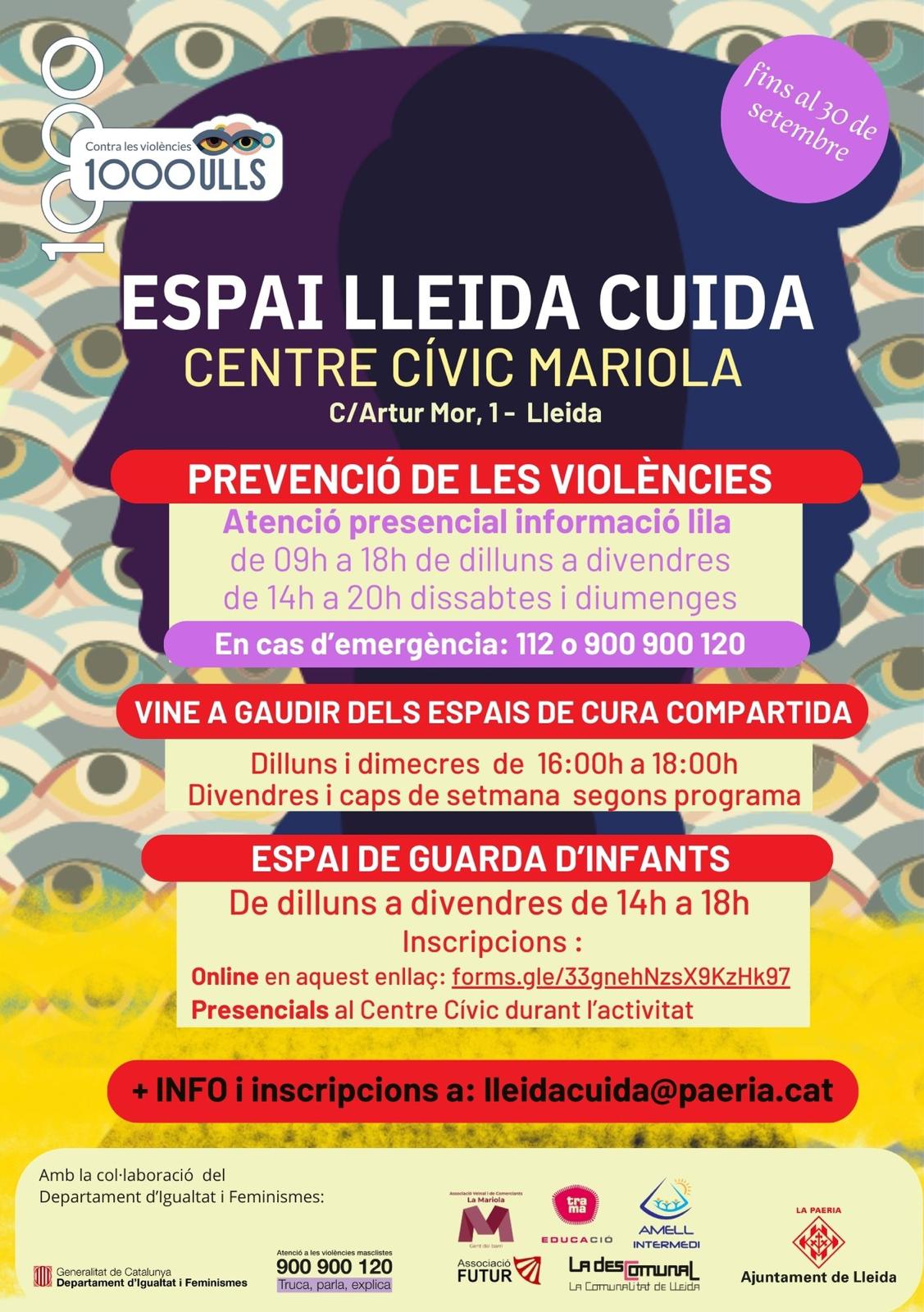 L’Ajuntament de Lleida ha posat en marxa al Centre Cívic de La Mariola la iniciativa Espai Lleida Cuida, una prova pilot que promou la creació de xarxa i l’apoderament femení. Es tracta d’un projecte, dins la campanya “1000 ulls”, que fomenta les cures des d’una perspectiva interseccional i LGTBI. Aquesta prova pilot proporciona un entorn segur per a les dones, implica la realització de diverses activitats per reflexionar i treballat la cura emocional, amb atenció especial a les necessitats familiars i dels infants. De moment, s’ha previst programació fins al 30 de setembre.
