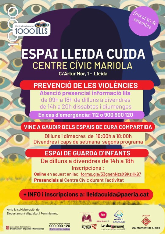 L’Espai Lleida Cuida, actiu fins al 30 de setembre, ofereix atenció i informació en prevenció de les violències, tallers, sortides i costura compartida, així com un espai de guarda d’infants les tardes de dilluns a divendres