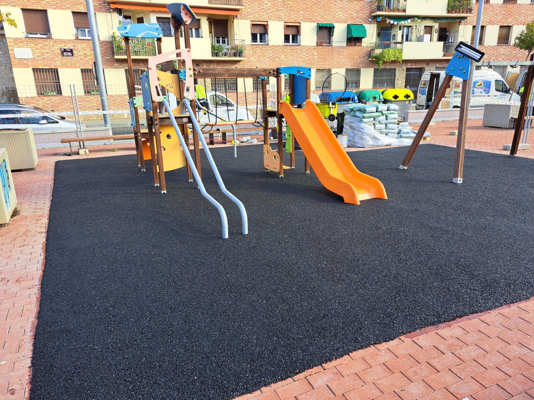 La Paeria aborda la millora del paviment amortidor de diverses àrees de joc infantils de la ciutat. L’actuació més important es du a terme a la plaça Sant Antoni Maria Claret, al Centre Històric, on ja s’han iniciat els treballs de renovació del paviment de cautxú. Aquest divendres es va deixar ja feta la capa base i dilluns està previst completar el paviment d’acabat amb una capa de color.