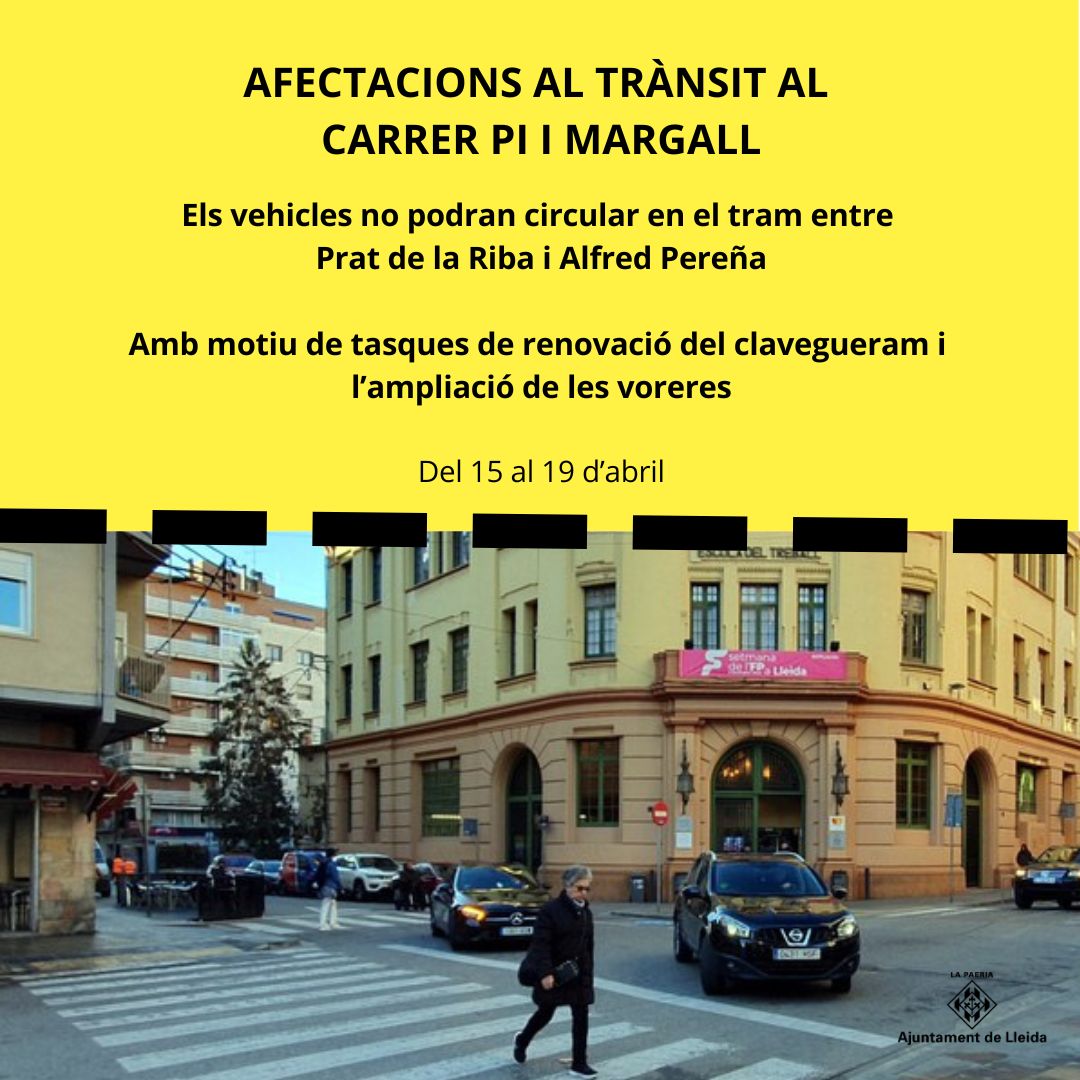 Les obres de renovació de l’entorn de l’escola del Treball obligaran a interrompre el trànsit de vehicles al tram del carrer de Pi i Margall, concretament en el tram situat entre l’avinguda de Prat de la Riba i el carrer d’Alfred Pereña, entre dilluns 15 i divendres 19 d’abril.