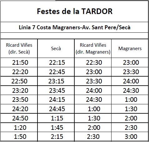 A més, hi haurà servei de bus nocturn els dies 28, 29 i 30 de setembre. S’ampliarà l’horari de la línia L7 que va Magraners-Secà segons els horaris que hi ha a la imatge adjunta. La parada més propera als espais festius serà la de la plaça Ricard Viñes.
