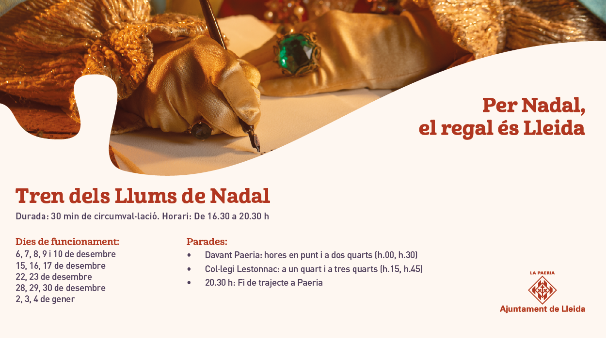 El Tren del Parc de Nadal, el Tren dels Llums de Nadal i el Tren del Fum Fum recorreran els carrers de Lleida durant aquest mes de desembre i, de manera gratuïta, permetran viure les activitats, els mercadets i la il·luminació nadalenca.