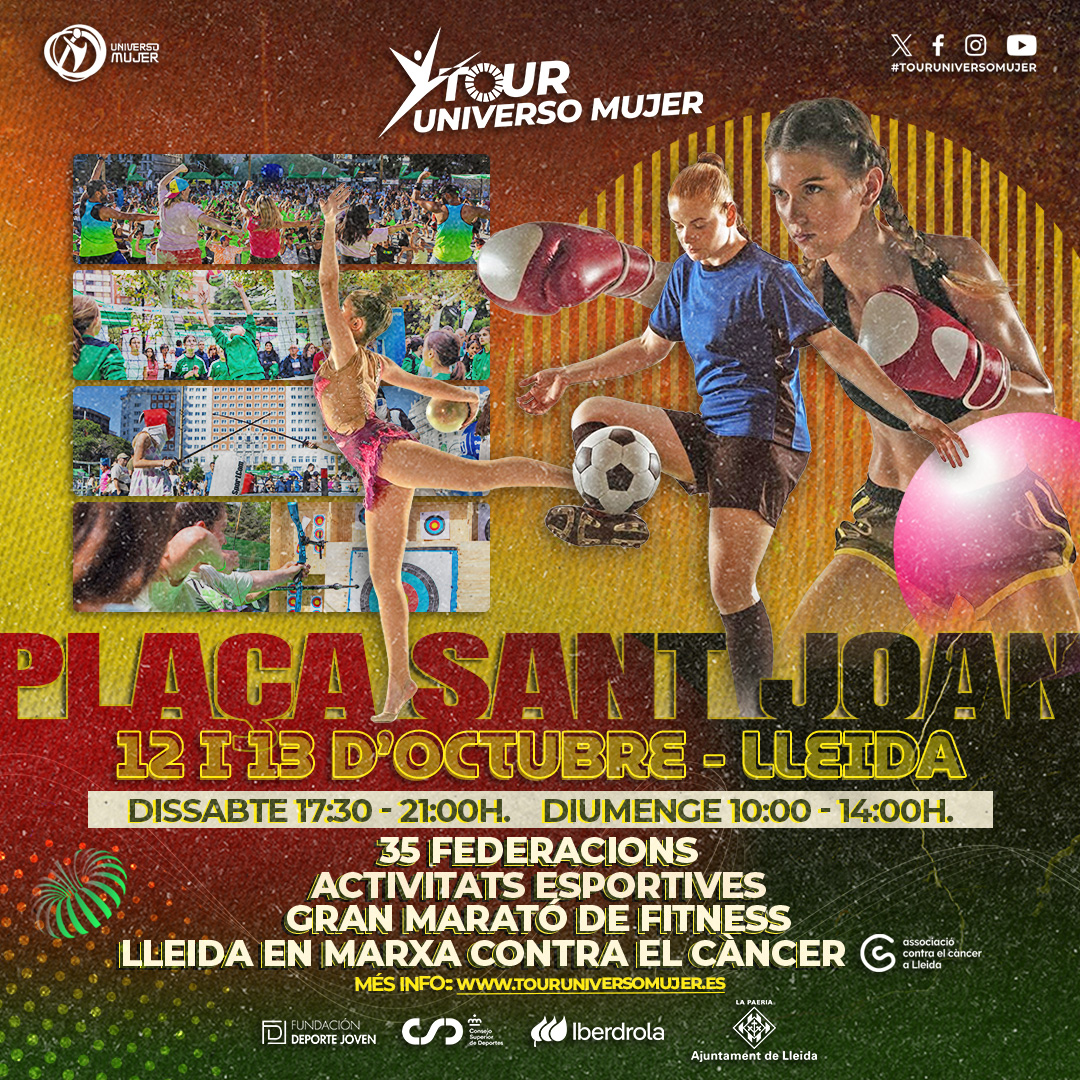 La gran festa de l'esport femení a la plaça Sant Joan de Lleida presenta un cartell replet d'activitats gratuïtes i per a tots els públics. El Tour Universo Mujer ha dissenyat conjuntament amb les Federacions nacionals, territorials i amb els clubs, una programació àmplia per practicar disciplines com el futbol, voleibol, karate, gimnàstica, rugbi, esquaix, pilota, tennis, tennis de taula, etc. Una trobada poliesportiva que combinarà el seu funcionament amb les actuacions de l'escenari.