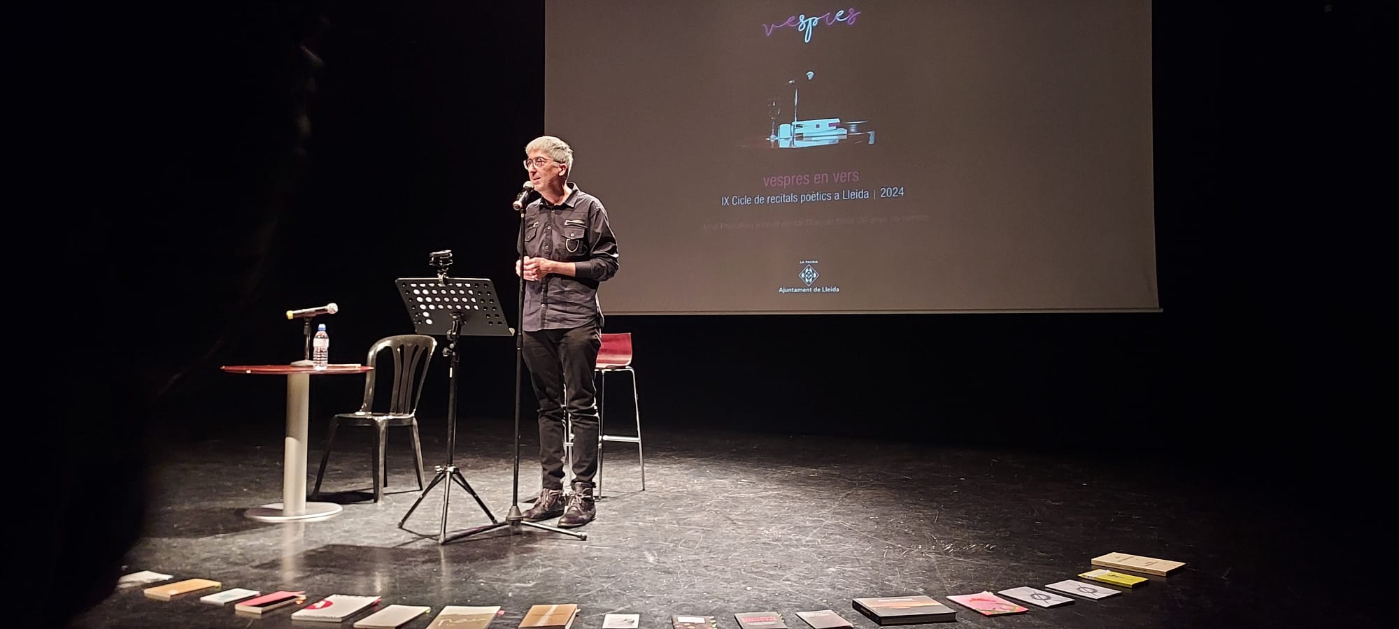 Un recorregut per la creació poètica i literària de Jordi Prenafeta ha tancat, aquest dimecres, el Vespres en vers 2024, IXè Cicle de Recitals Poètics a Lleida, al Teatre Municipal de l’Escorxador. El mateix poeta ha recitat part de la seva obra, des dels inicis fins a l’actualitat, tres dècades recollides en l’espectacle "Diari de bord".