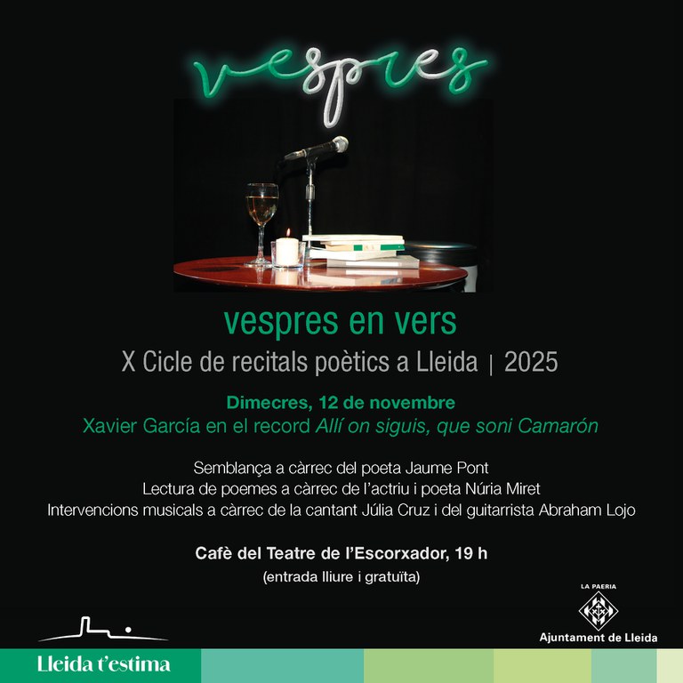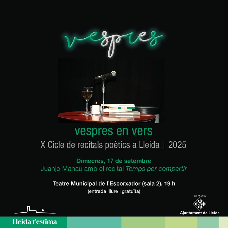 El cicle poètic Vespres en Vers torna al setembre per celebrar la seva desena edició donant veu a poetes lleidatans en tres sessions durant els mesos de tardor. Dos d'elles són recitals antològics, de Juanjo Manau i Àngels Marzo, mentre que la tercera sessió és un acte en record al poeta Xavier Garcia.