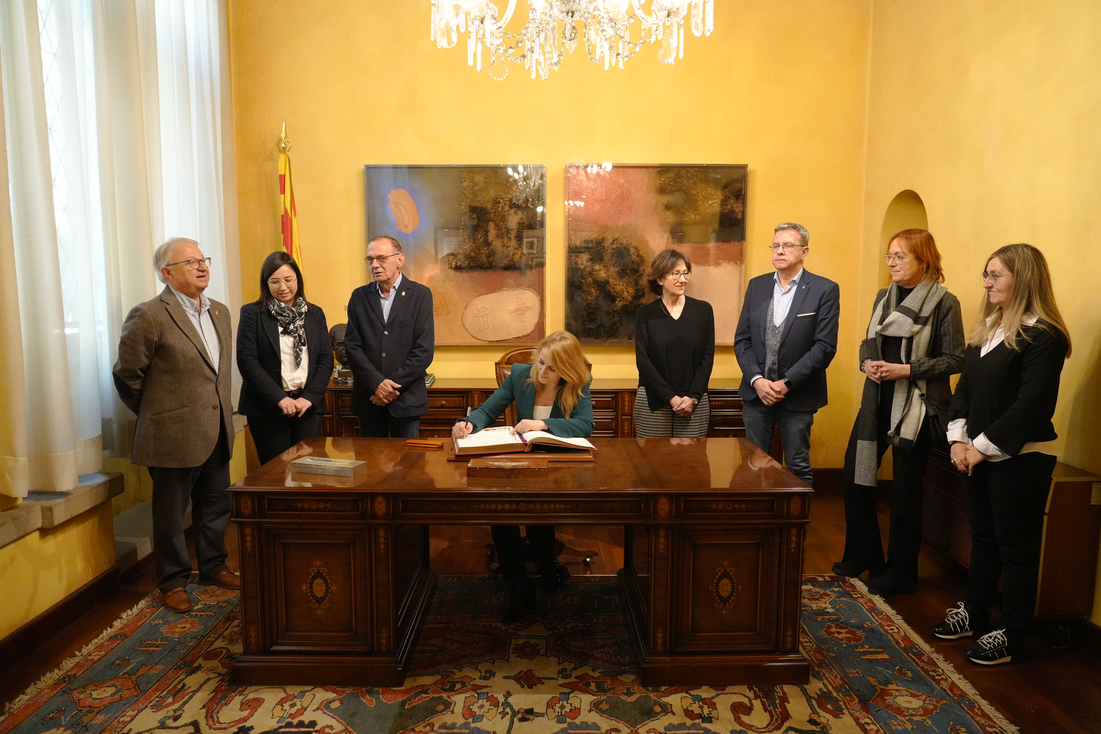 El paer en cap, Miquel Pueyo, i la delegada territorial del Govern, Montse Bergés, han rebut la consellera a l’entrada del palau consistorial i l’han acompanyada fins al despatx noble de la Paeria, on hi havia els tinents d’alcalde Jordina Freixanet, Montse Pifarré i Paco Cerdà.