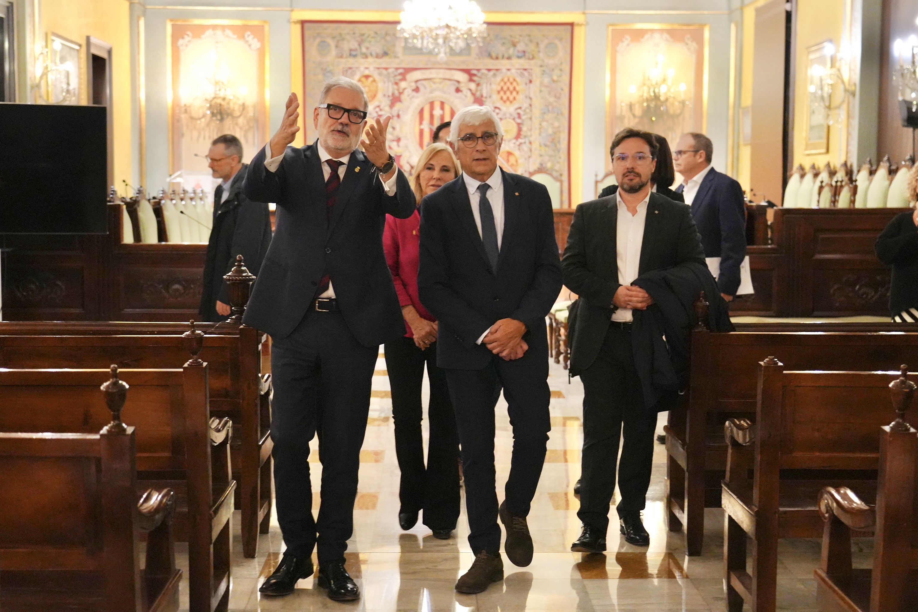 L’alcalde Larrosa ha explicat al conseller Balcells la història de la planta noble de La Paeria en un visita en què també hi ha participat les regidores Anna Miranda i Neus Caufapé, i el regidor Xavier Estrada.