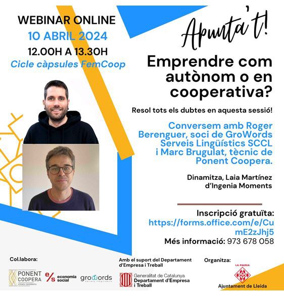 El webinar aprofundirà en el model cooperatiu, també en les ajudes FemCoop i en altres formes d'emprendre que no són tan conegudes. S’exposarà el cas pràctic de Growords, una cooperativa de Serveis Lingüístics que han estat treballant com autònoms, i ara com a cooperativa. Hi intervindrà un soci de Growords Serveis Lingüístics SCCL, així com Marc Brugulat, tècnic de Ponent Coopera, als quals es podrà consultar i preguntar qualsevol dubte que es generi. L’acció estarà dinamitzada per Laia Martínez, d’Ingenia Moments.