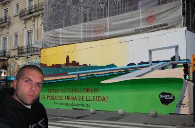 L'artista lleidatà Seone ha decorat la tanca que cobreix les obres de rehabilitació de la façana de l’Edifici Pal.las