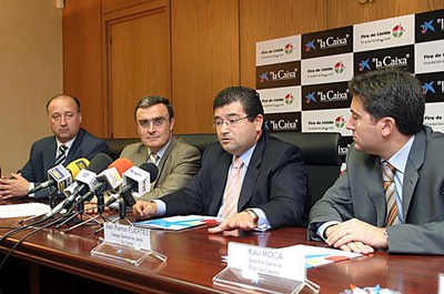 Àngel Ros, alcalade de Lleida i president del Patronat de la Fundació La Fira de Lleida, i Joan Ramon Fuertes, delegat general de Lleida de La Caixa d’Estalvis i Pensions de Barcelona, “la Caixa”, han signat un conveni de col·laboració destinat a fomentar activitats de promoció i dinamització econòmica i social desenvolupades en el marc dels salons que es fan a la Fira de Lleida.