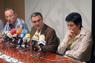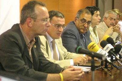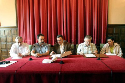 El conseller de Política Territorial i Obres Públiques, Joaquim Nadal, i l'alcalde de Lleida, Àngel Ros, signen el conveni que farà possible la remodelació integral del barri