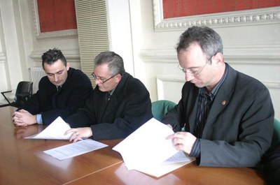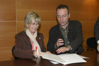 Xavier Sàez, tinent d’alcalde de l’àmbit de Cultura, Esports i Drets Civils, i Ma Carme Mata, presidenta de la Creu Roja Espanyola a Lleida, han signat un conveni de col·laboració per potenciar el voluntariat a l’àrea de Cooperació Internacional de l’Ajuntament.