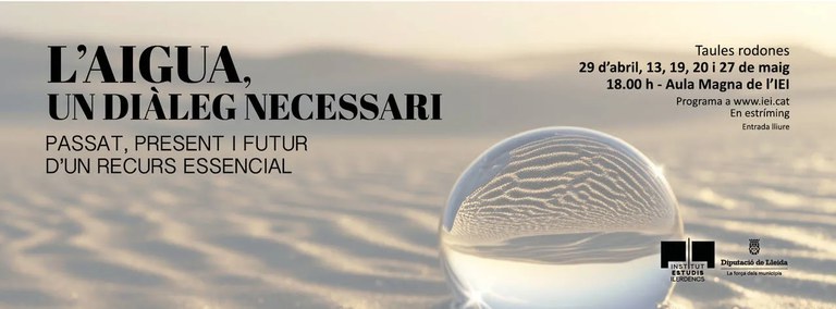 Ciclo de mesas redondas sobre el agua en las Tierras de Lleida desde diferentes perspectivas: la gobernanza, los usos y aprovechamientos, la educación, la innovación y el cambio climático. El ciclo se combina con acciones poéticas y musicales. El ciclo se realiza en el Instituto de Estudios Ilerdenses del 29 de abril al 27 de mayo. Marc Sans, del Museu de l'Aigua de Lleida, participa en la mesa de educación el 19 de mayo a las 18h