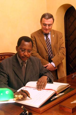Mohamed Salia, el regidor de Cooperació, X.Aluja i l'alcalde de Lleida al saló del Retaule