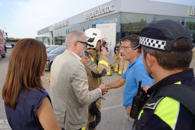 L’alcalde Larrosa s’ha desplaçat fins a les dependències del concessionari per a conèixer de primera mà els detalls de l’incendi i l’estat de les persones que hi treballaven