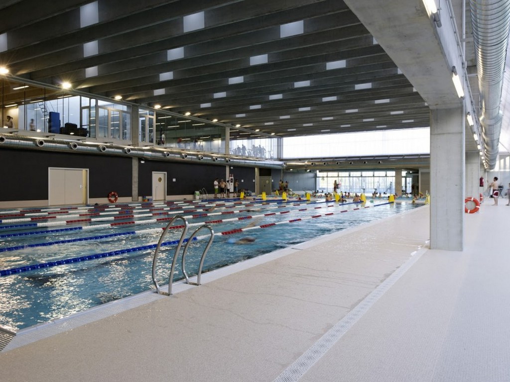 Espais esportius: 1 vas de 16,5m x 8m (1,2-1,2m de prof) per aigua/nat. ens. 1 vas de 8.5m x 8,5m (72,25m² I 1,03m de prof. per nat. recr/ d'ense. 1 vas de 25m x 16,6m (415m²m 8 carrers de 1,9-1,8m de prof) per nat. 1 sala de 21,87 m x 15,3m (334,61m² spinning). 1 sala de 13,2m x 9,62m (128m² spinning) 1 sala de 13,2m x 9,84m (129m² per musc. i tonif.) 1 sala de 16m x 13,2m (211m² per act. dirig).