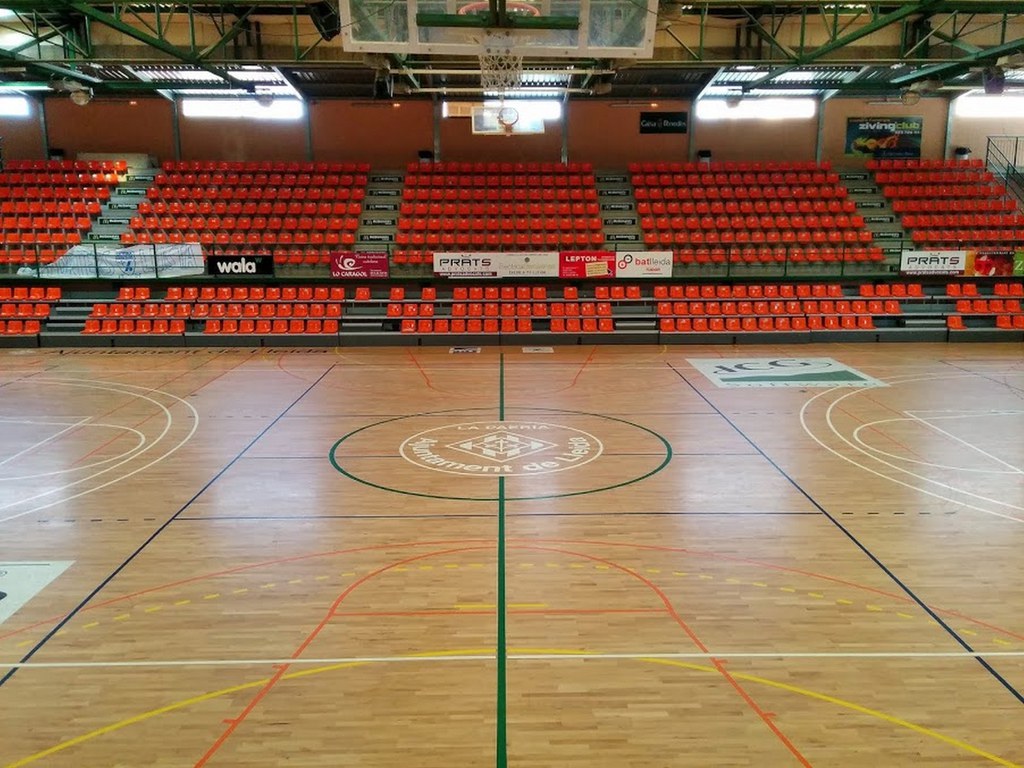 Espais esportius: Disposa d'una pista triple poliesportiva de 2.235m². La superfície útil de joc és de 45m x 35m (1.257m²) amb paviment de parquet amb les línies marcadors per hoquei patins i handbol.